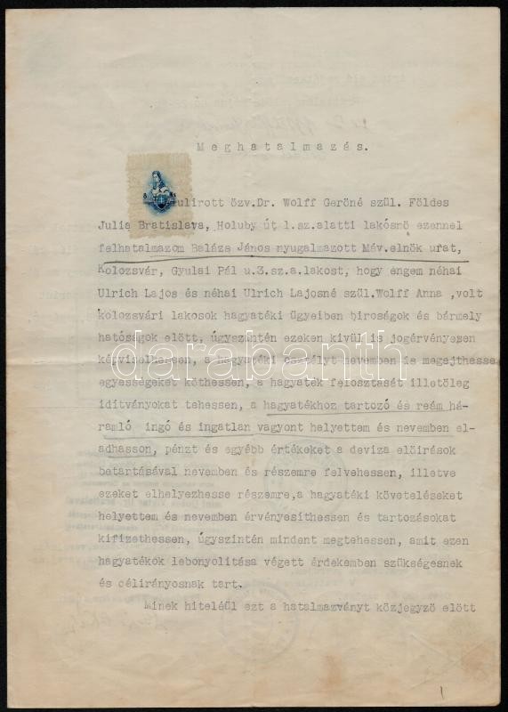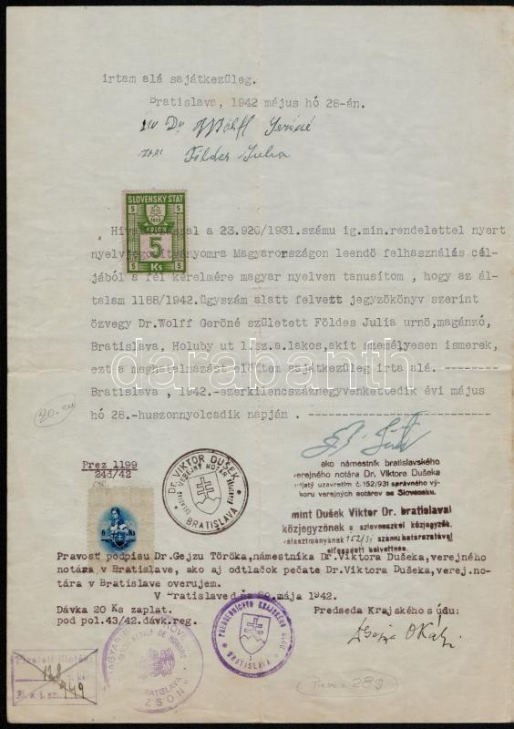 Leírás: 1942 Pozsony, Magyar nyelvű meghatalmazás szlovák okmánybélyegekkel