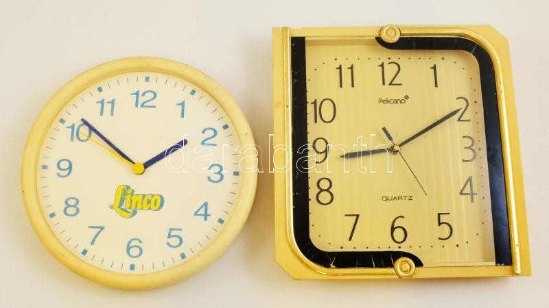 Leírás: 2 db kvarc falióra (Junghans, Pelicano), működik, d: 25 és 26 cm