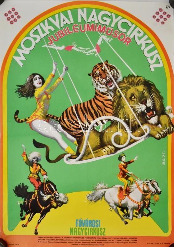 1975 Benkő Sándor (1922-2007): A Moszkvai Nagycirkusz jubileumi műsora a Fővárosi Nagycirkuszban, műsorplakát, Magyar Hirdető, Offset és J. Nyomda, 67×48 cm