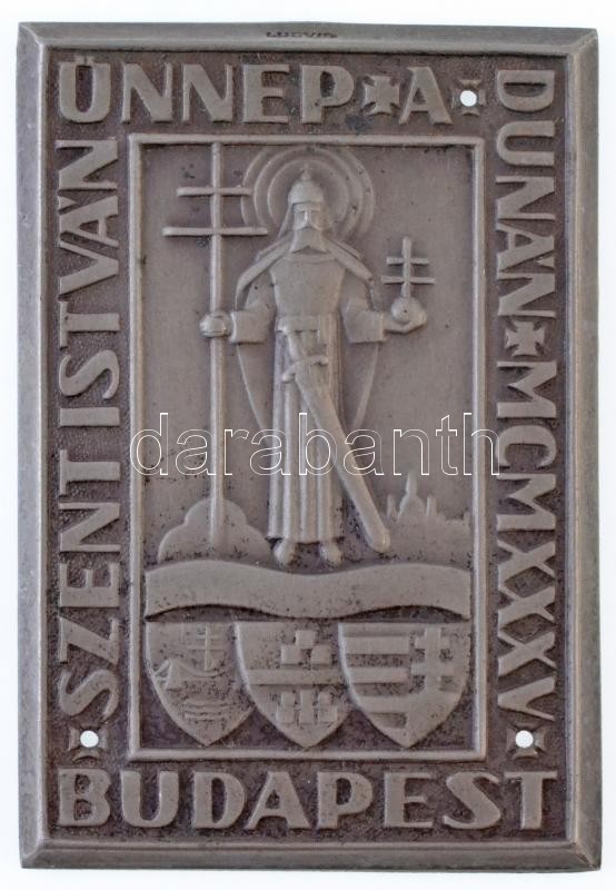 Leírás: 1935. "Szent István Ünnep a Dunán - Budapest" fém plakett "R." jelzéssel, a peremén "LUDVIG" beütés, három lyuk rögzítéshez (48x69mm) T:2