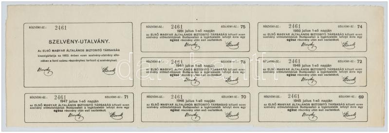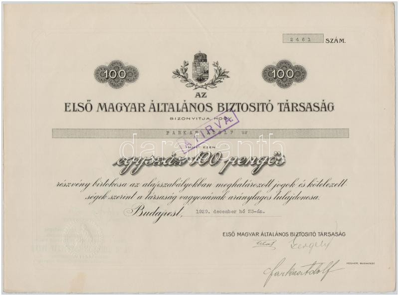 Budapest 1929. "Első Magyar Általános Biztosító Társaság" névre szóló részvénye 100P-ről, vízjeles papíron, szárazpecséttel, szelvényekkel, bélyegzésekkel T:I-