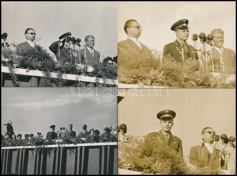 1961 Budapest, Jurij Alekszejevics Gagarin (1934-1968) űrrepülő látogatása Magyarországon, Kállai Gyula és Marosán György társaságában a Hősök terén, 4 db fotó, 9×12 cm