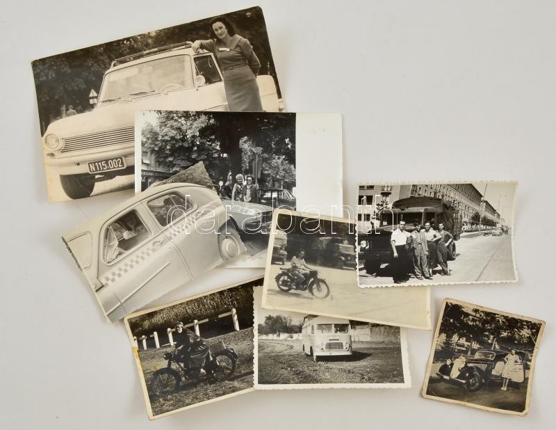 Leírás: cca 1945-1980 Járművek (motor, személyautó, teherautó), 8 db vegyes állapotú fotó, 5,5×5,5 és 9×14 cm közötti méretekben
