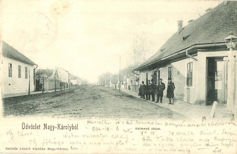 Leírás: 1902 Nagykároly, Carei; Kalmand utca, üzlet, kocsma. Kiadja Csókás László / street view, shop, inn