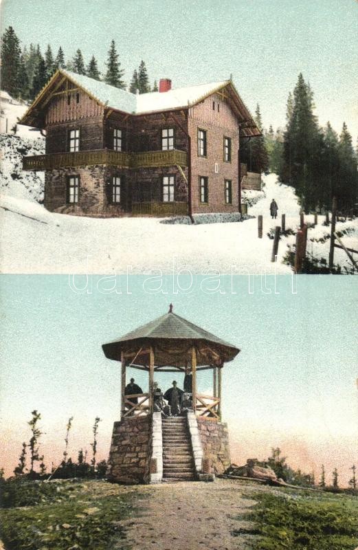 Leírás: 1916 Szebenjuharos, Hohe Rinne, Paltinis; szálló, kilátó torony / Wohnpavillon, Conrad Warte aus dem Oncest / hotel, lookout tower (EK)