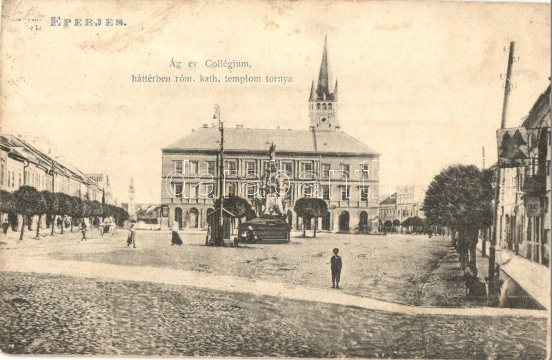 1907 Eperjes, Presov; Evangélikus kollégium, háttérben a római katolikus templom tornya, Szentháromság szobor. Fénynyomat Divald műintézetéből / Lutheran college, tower of the Catholic church, Trinity statue (EK)