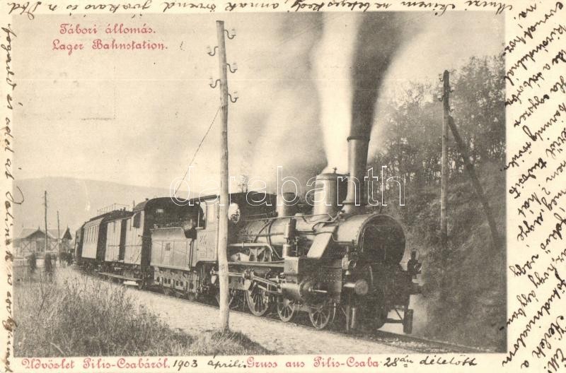 1903 Pilicsaba, Tábori vasútállomás, gőzmozdony, szerelvények https://www.darabanth.com/hu/339-Gyorsarveres/339.0/Kepeslapok/Magyarorszag~2000005/1903-Pilicsaba-Tabori-vasutallomas-gozmozdony-szerelvenyek~II1904399