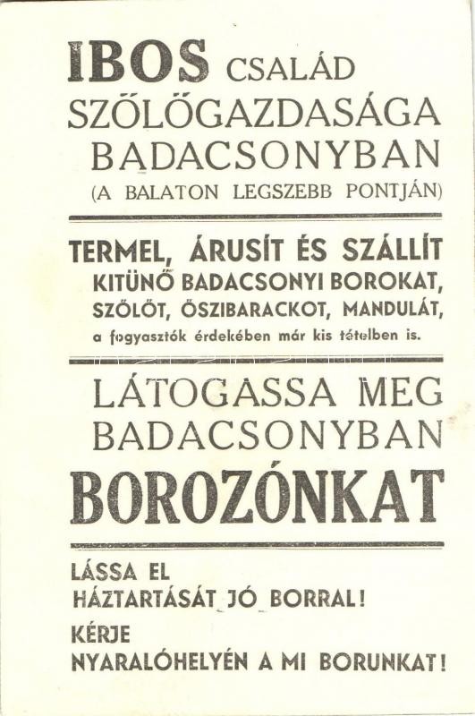Leírás: Badacsony, Ibos család szőlőgazdasága, szőlőrészlet a házzal, Ibos kúria, pince belső. Hátoldalon reklám (non PC)