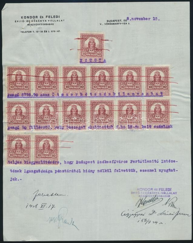 Leírás: 1928 Bp., Kondor és Feledi Építő- és Kőbánya Vállalat Részvénytársaság nyugtája, okmánybélyegekkel