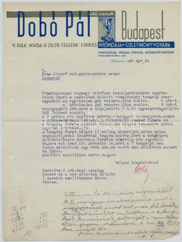 1942 Bp.V., Dobó Pál nyomdája és Üzletikönyv Gyára fejléces levélpapír... https://www.darabanth.com/hu/339-Gyorsarveres/339.0/Mutargy-papirregiseg-egyeb/Okmanyok~2000089/1942-BpV-Dobo-Pal-nyomdaja-es-Uzletikonyv-Gyara-fejleces-levelpapirjara-irt-level~II1905986