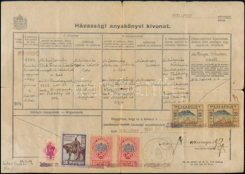 Leírás: 1944 Budapest, származási igazolvány kiállítása végett kiállított házassági anyakönyvi kivonat okmánybélyegekkel