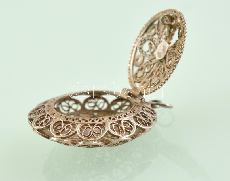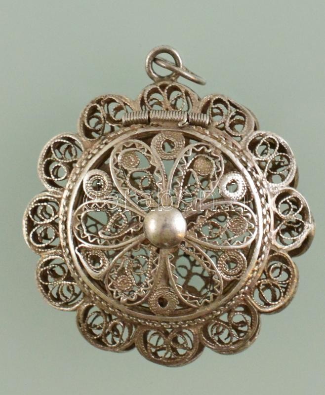 Leírás: Ezüst(Ag) nyitható filigrán medál, jelzett, sérüléssel, d: 3,4 cm, nettó: 7,9 g