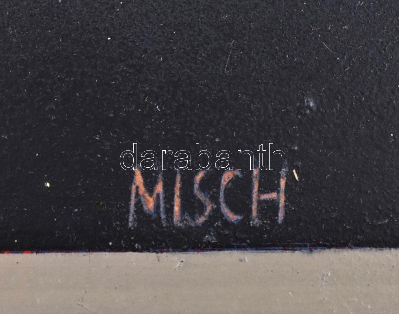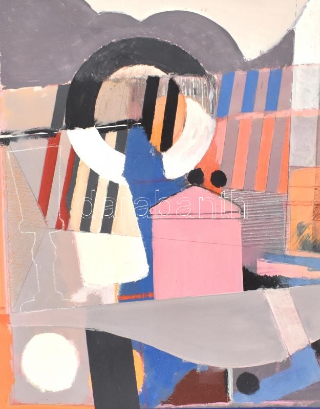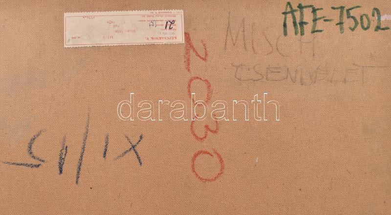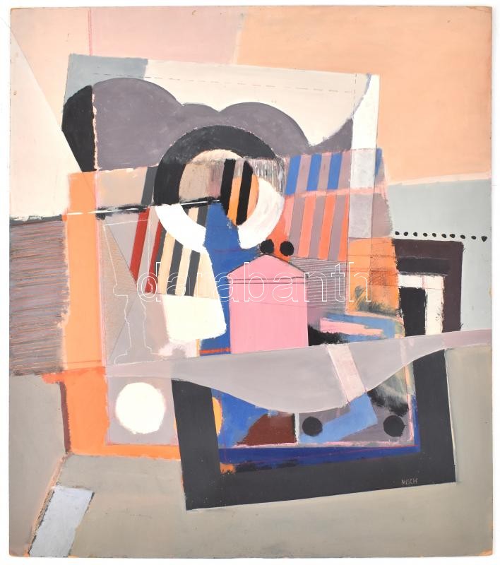 Misch Ádám (1935-1995): Csendélet (konstruktivista kompozíció). Olaj, kréta, ceruza, farost, jelzett (Misch), hátoldalán autográf felirattal és Képcsarnok Vállalat címkéjével. 1978-79 körül. 70×60 cm. / Ádám Misch: Still life (constructivist composition) Oil, chalk, pencil on wood fiber, signed (Misch), with autograph description and with Hungarian Képcsarnok Company label on the reverse. Around 1978-79. 70×60 cm.