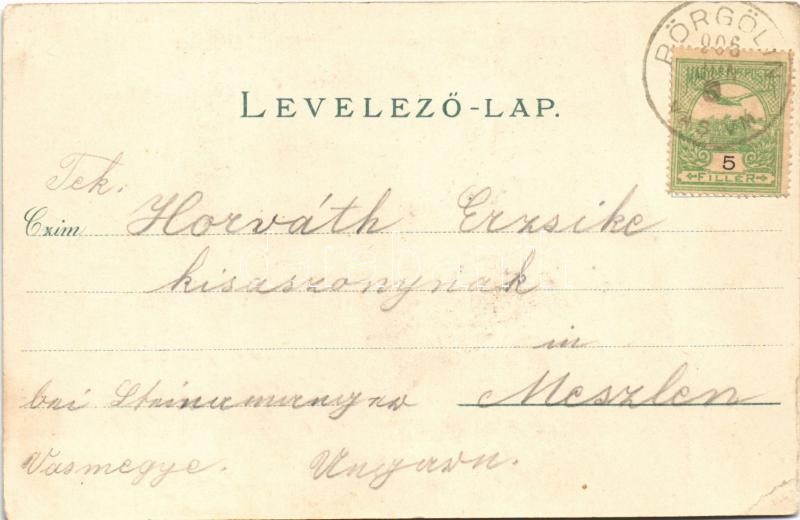 1906 Pörgölény, Pörgölin, Pilgersdorf; tér, templom, Kopfstein Miksa üzlete és saját kiadása / Platz, Kirche, Geschäft / square, church, shop. Art Nouveau (EK)