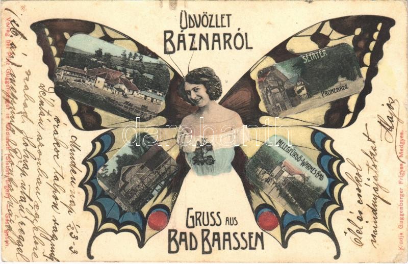 1905 Báznafürdő, Baile Bazna, Bad-Baassen; sétatér, meleg fürdő. Montázs pillangó hölggyel, Guggenberger Frigyes kiadása / promenade, spa. Montage with butterfly lady