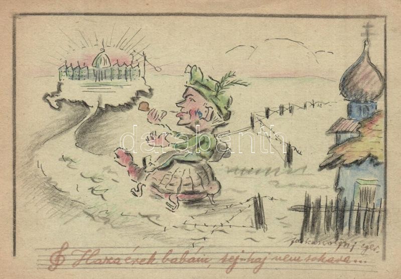 Leírás: 1942 Hazaérek babám, sej-haj nemsokára... Kézzel rajzolt Tábori Postai Levelezőlap / WWII Hungarian hand-drawn military greeting art postcard s: Farkasvölgyi (EK)