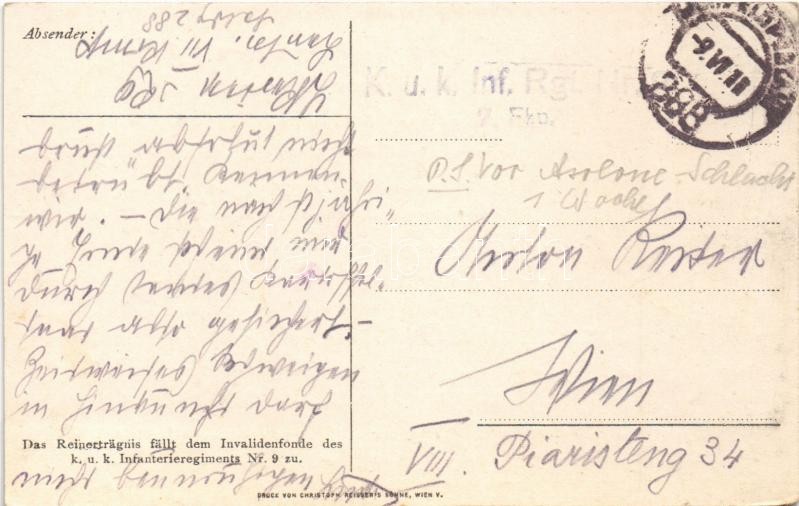 Leírás: Cs. és kir. 9. gyalogezred segélylapja / K.u.K. Inf. Reg. 9. 1914-18. / Austro-Hungarian military charity art postcard (EK)