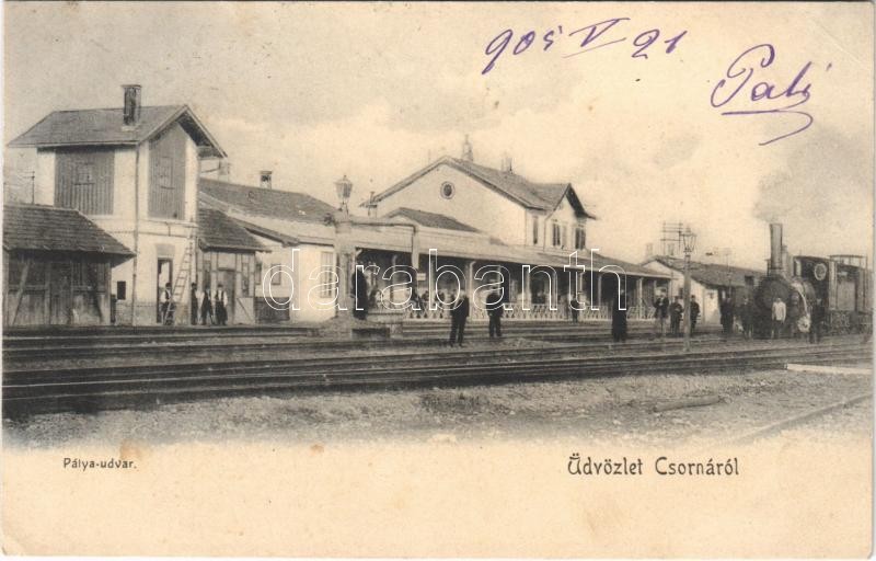 Leírás: 1905 Csorna, pálya-udvar, vasútállomás, gőzmozdony. Martinesevics Károly kiadása