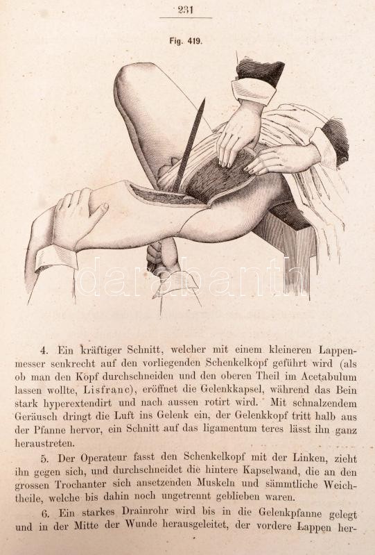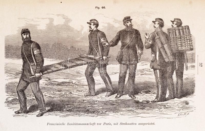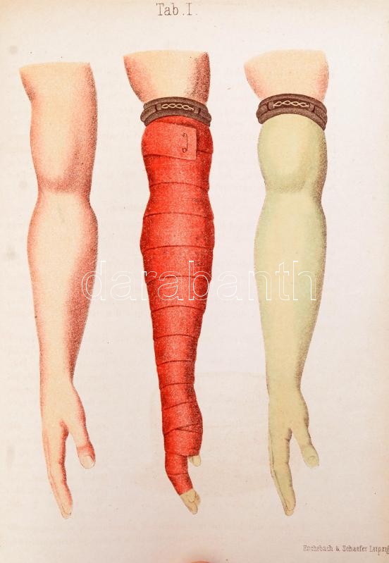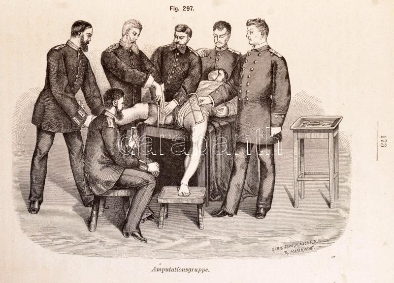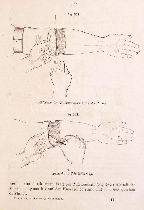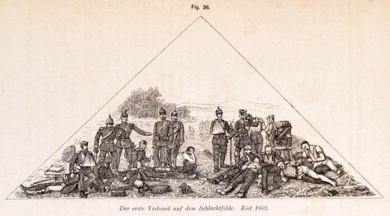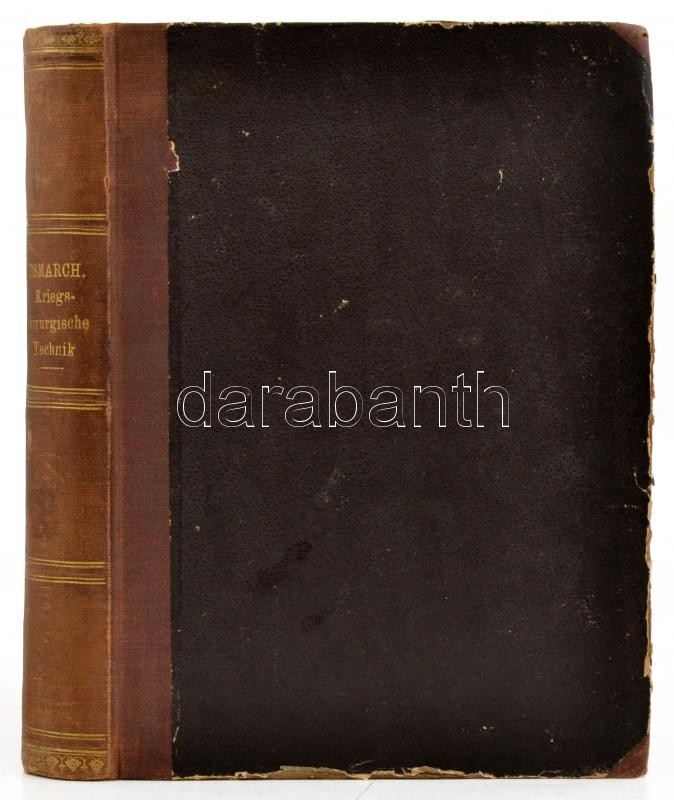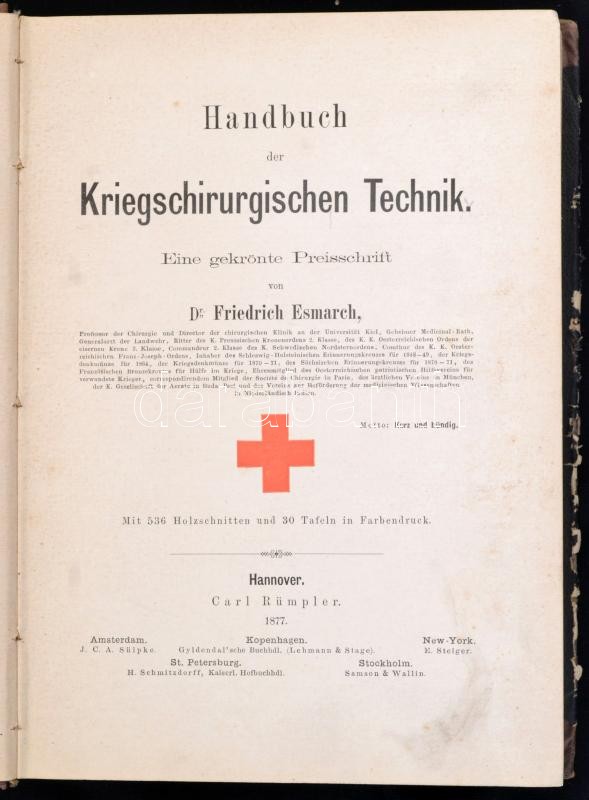 [Friedrich von Esmarch (1823-1908)]: Dr. Friedrich Esmarch: Handbuch der Kriegschirurgischen Technik. Hannover, 1877., Carl Rümpler, XV+316 p.+XXX t. Nagyon gazdag képanyaggal illusztrált. Szövegközti és egészoldalas fametszetű illusztrációkkal és színes litografált képtáblákkal. Német nyelven. Első kiadás. Későbbi átkötött félvászon-kötésben, kopott borítóval, de belül jó állapotban./