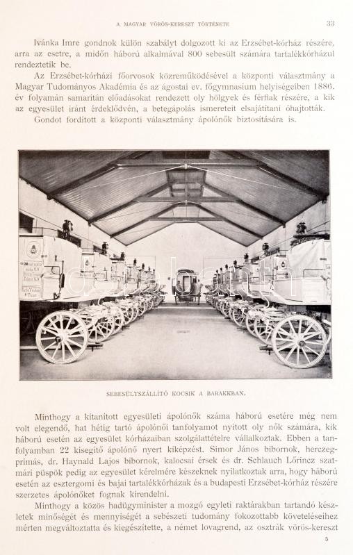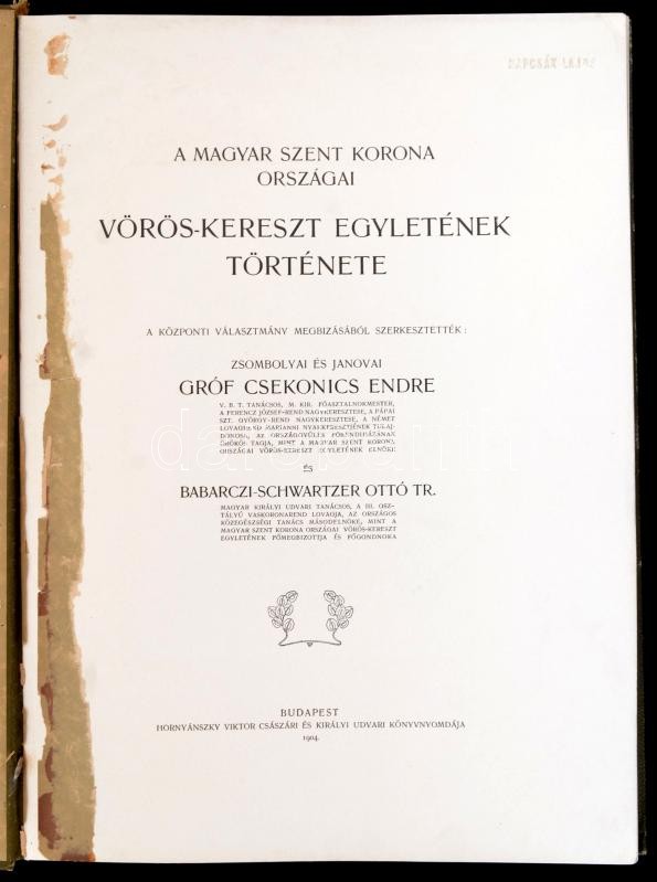 Csekonics Endre-Babarczi-Schwartzer Ottó: A Magyar Szent Korona országai Vörös-Kereszt Egyletének története. 1879-1904. A központi választmány megbízásából szerkesztették: zsombolyai és janovai gróf - - és - -. Bp., 1904, Hornyánszky Viktor, 4 (I. Ferencz József, Mária Valéria főhercegnő, Lajos Győző főherceg és Klotild főhercegné, heliogravűr, a képtáblák előtt hártyapapírral) t.+VII+200+4 p. Egyetlen kiadás. Szövegközti és egészoldalas fekete-fehér képanyaggal illusztrált. Kiadói aranyozott, festett egészvászon-kötés, Gottermayer-kötés, a borítón a vöröskereszt címerével, kissé kopott borítóval, kissé sérült gerinccel, hiányzó elülső szennylappal, a címlapon névbélyegzővel.