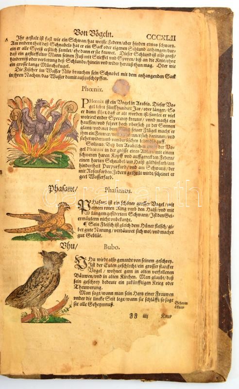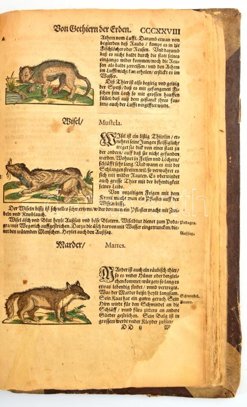 [Lonicer, Adam (Adamus Lonicerus) (1528-1586)]: Kreuterbuch, künstliche Conterfeytunge der Bäume, Stauden, Hecken, Kreuter, Getreyde, Gewürtze, mit eigentlicher Beschreibung derselben Namen, in sechserley Spraachen, nemlich, griechisch, latinisch, italianisch, frantzösisch, teutsch und hispanisch, und derselben Gestalt, natürlicher Krafft vnd Wirckung. Sampt künstlichem und artlichem Bericht deß Destillierens. Item von fürnembsten Gethieren der Erden, Vögeln, und Fischen. Deßgleichen von Metallen, Ertze, Edelgesteinen, Gummi, vnd gestandenen Säfften. Franckfort, 1582, Christian Egenolff, 1 (címlap) t.+2 (kézzel írt jegyzetlap) sztl. lev.+13 sztl.+764 (CCCLXXXII számmal számozott lap)+1 p.+3+6 sztl.lev. Rengeteg, fametszetű, nagyrészt kézzel színezett illusztrációval. Kopott félpergamen-kötésben, számos restaurált lappal, köztük jó pár a szöveget is érintő kisebb-nagyobb restaurálással, a lapokon foltok, szakadások, közte sérült lapok is, valamint 4 hiányos lappal (I., CCCXXXVIII., CCCLI, és az utolsó lapot követő első sztl. lev.), pár lapon sarkán hiánnyal, az utolsó lapot követő első két számozatlan levél sérült, hiányos, amit kézzel írt betoldás javít ki, a könyv elején két betoldott lapon és az utolsó 6 betoldott lapon kézzel írt jegyzetek, köztük az év hónapjaira vonatkozók is (márc-dec), a szövegben néhol lapszéli jegyzetek. További restaurálásra szoruló, nagyon ritka, német nyelvű füvészkönyv./ /Franckfort, 1582, Christian Egenolff, 1 (title page) t.+2 (handwritten notice pages) unnumbered leaves+13 unnumbered leaves+764 (CCCLXXXII) + 1 p.+3+6 unnumbered leaves. With lot of wood engraving illustrations, mostly colored. Half-parchement-binding, with worn cover, with a restored pages, many restoration involving the text, with damaged, spotty pages, 4 pages damaged and incomplete, with damaged on some pages corner, two pages in the end of the book damaged and with handwritten repairing, with extra handwritten pages in the begining (2) and the end (6) of the book, with notices on some pages. In German language. Needs more restoration. Very rare!