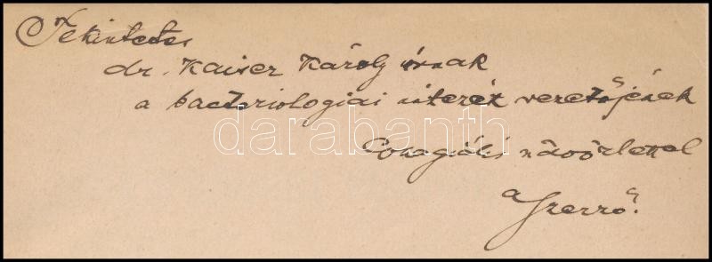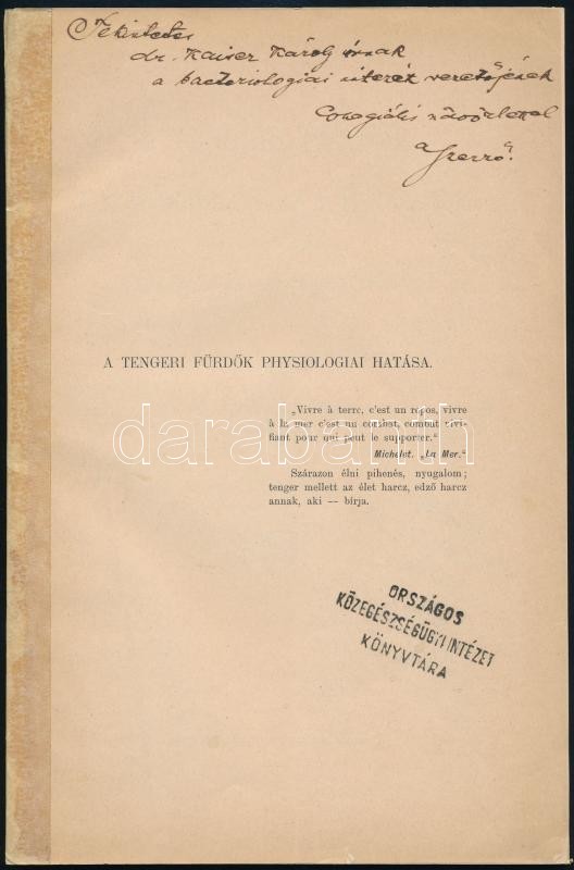 Preysz Kornél: A tengeri fürdők physiologiai hatása, különös tekintettel az északi és keleti tenger fürdőire. 1892 nyarán tett tanúlmányútja alapján írta: - -. Bp., 1893., Eggenberger, (Kolozsvár, Ajtai K. Albert-ny.), 80 p. Papírkötésben, hiányzó borítóval, javított gerinccel, intézményi bélyegzőkkel. A szerző, Dr. Preysz Kornél (1859-1925) orvos, közegészségügyi felügyelő által dr. Kaiser Károly (1864-1929) vegyész orvos, később a bakteriológiai és közegészségügyi központ vegyvizsgáló állomásának igazgatója részére dedikált
