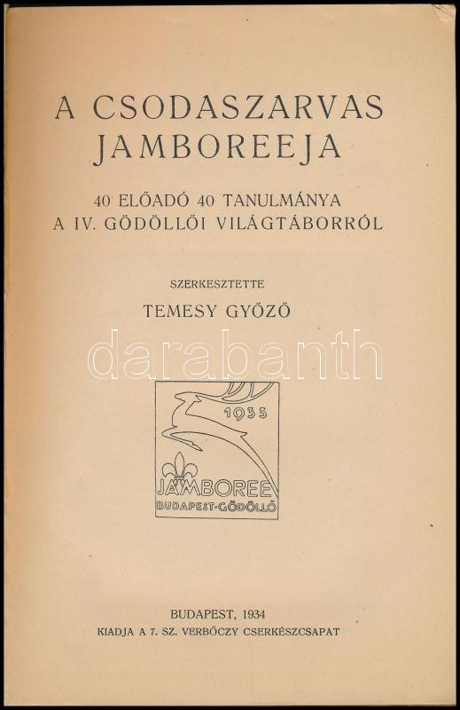 A csodaszarvas jamboreeja. 40 előadó 40 tanulmánya a IV. gödöllői világtáborból. Szerk.: Temesy Győző. Bp., 1934, 7. sz. Verbőczy Cserkészcsapat, (Élet-ny.), 224 p. Kiadói illusztrált papírkötésben, a borító egy egészen kicsit elvált a gerinctől.
