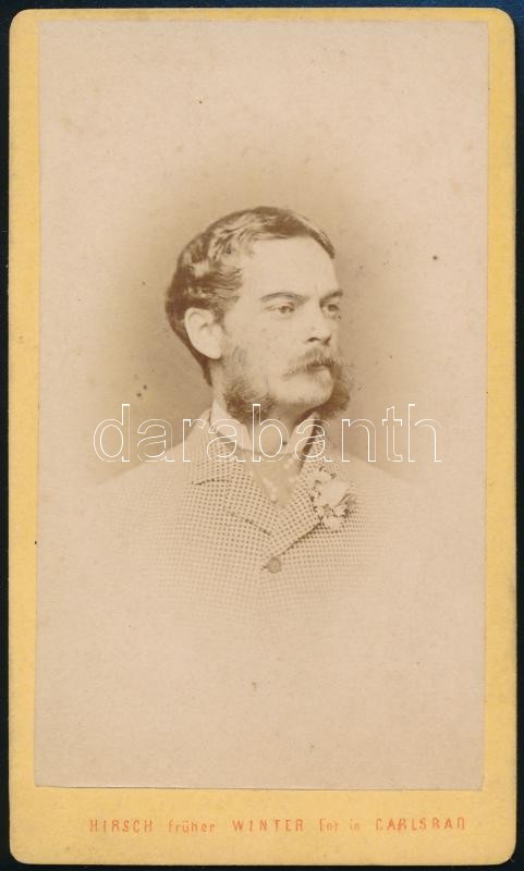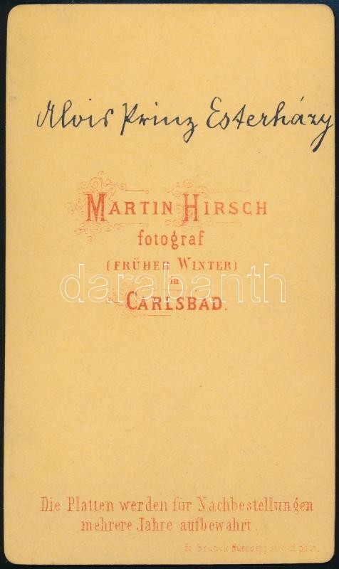 Leírás: cca 1870 galántai Esterházy Alajos (1844-1912) herceg, lovassági tábornok, keményátú fotó, Carlsbad, Martin Hirsch, 10x6 cm