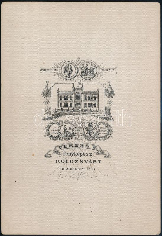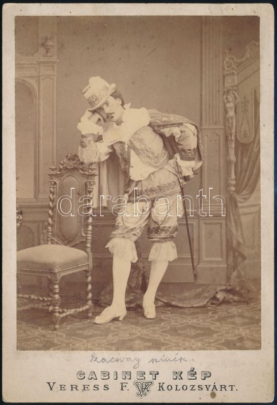 cca 1874 Esztelneki Szacsvay Imre (1854-1939) színész, kabinetfotója Veress Ferenc kolozsvári fényképész műterméből, kolozsvári színház (1874-1884), majd a budapesti Nemzeti Színház tagja (1884-1913), 1909-től örökös tagja, 11x16 cm