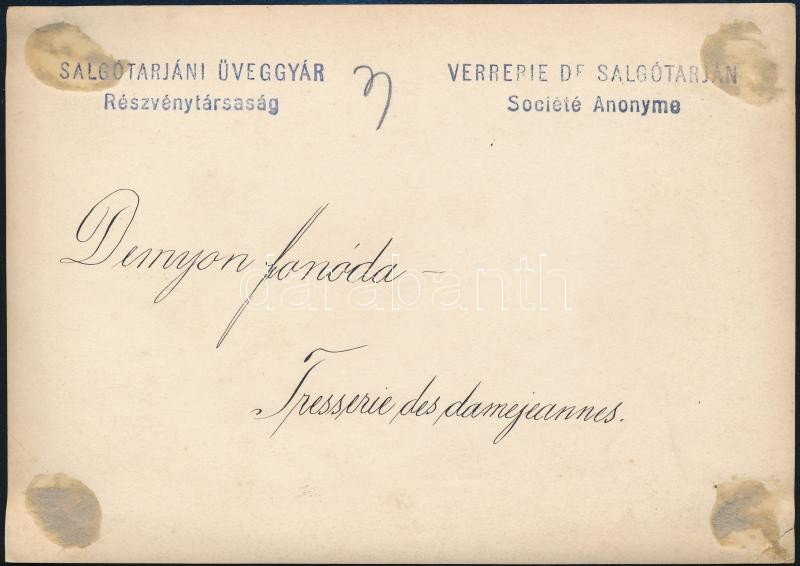 cca 1930 A Salgótarjáni Üveggyár Rt. demizson fonodájának részlete, fotó, a hátoldalon pecséttel jelzett: "Salgótarjáni Üveggyár Rt.", feliratozva, 12x17 cm
