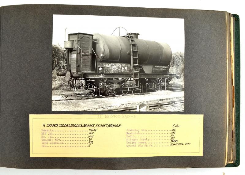 cca 1976 A BHÉV vontatott teher- és üzemi járműveinek adat és képgyűjteménye. 138 fénykép, alatta a vonat és hév kocsik részletes műszaki adataival, funkció szerinti csoportosításban. Műbőr kötésű mappában. 38x24 cm / Collection of the railway coaches and wagons of the Budapest Local Railways Company. 138 photos and detailed technical information.