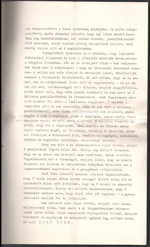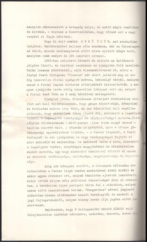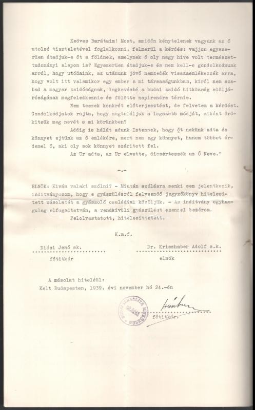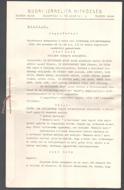 1939 A Budai Izraelita Hitközség gyászülésének jegyzőkönyve melyen Gerő (Grünhut) Ödön (1863-1939) Irodalmár, műkritikusról emlékeztek meg. 4 oldal, hajtva