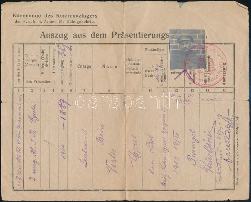 1918 Osztrák-magyar, újpesti hadnagy hadifogoly fényképes igazolványa, "Kommando des Kontumazlegers der k.u.k. 4. Armee für Heimgekehrte" fejléces papíron, "K.u.k. Abwehroffizier des Übernahme Station Nr. 403." bélyegzéssel.