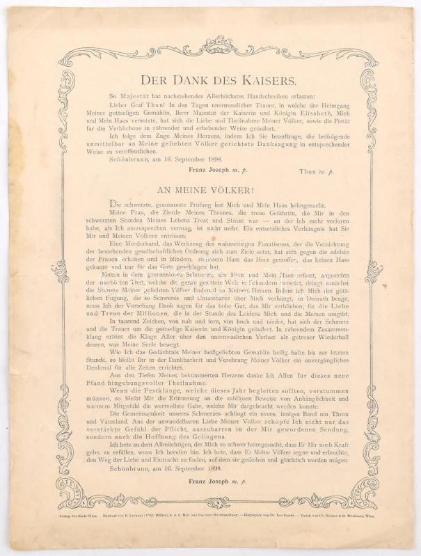 1898 Erzsébet királyné (1837-1898), német nyelvű képes emléklap, borítón Sissi arcképével és császári címerrel, Ferenc József köszönő írásával és népeihez szóló felhívásával. 2 levél (4 számozatlan oldal), lap szélén két kisebb szakadással. 30,5x23 cm / 1898 Empress Elisabeth (Sissi, Sisi), memorial in German language, 4 pages, with text by emperor Franz Jospeh. With two small tears on the side.30,5x23 cm