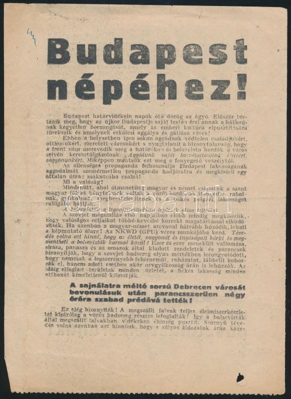 1944 Budapest népéhez! Antibolsevista, kitartásra felszólító II. világháborús kétoldalas röplap, bal felső sarkában tollas firkával, jobb alsó sarkában kisebb lyukkal. 20x14,5 cm