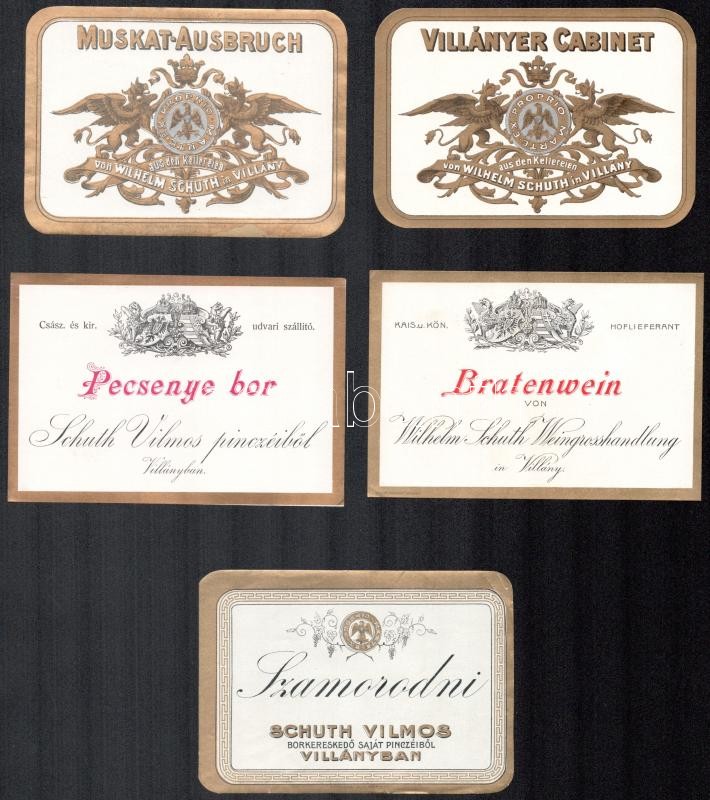 12 db Schuth Vilmos Villány, cs.. és kir. udvari szállító, boros címke, 1900 körül / Wilhelm Schuth Willand (Villány), k. u. k. Hoflieferant, wine labels, 13 pcs
