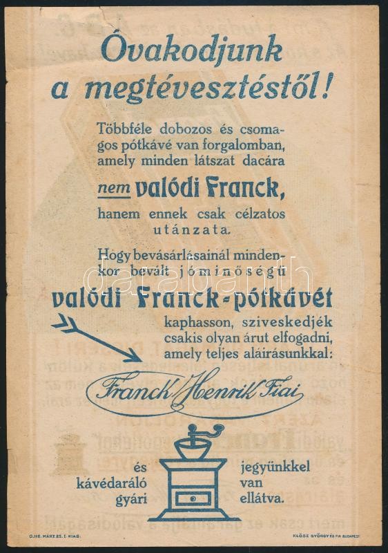 "A mi a tudásban az ABC. Az a konyhában a Franck-kávé!", Franck Henrik... https://www.darabanth.com/hu/34-Nagyaukcio/34.1/Mutargy-papirregiseg-egyeb/Reklam~14270/A-mi-a-tudasban-az-ABC-Az-a-konyhaban-a-Franck-kave-Franck-Henrik-es-Fiai-reklamnyomtatvC3~II2250030