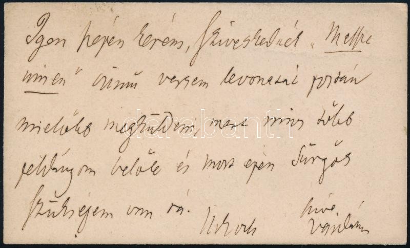 1891 Vajda János (1827-1897) költő, író autográf sorai névegykártyáján, melyben kéri, hogy Messze innen c. verséből küldjön vissza a címzett egy példányt, mert neki nincsen, illetve az Élet c. újságból, amelyben verse jelent meg, szintén kér egy példányt