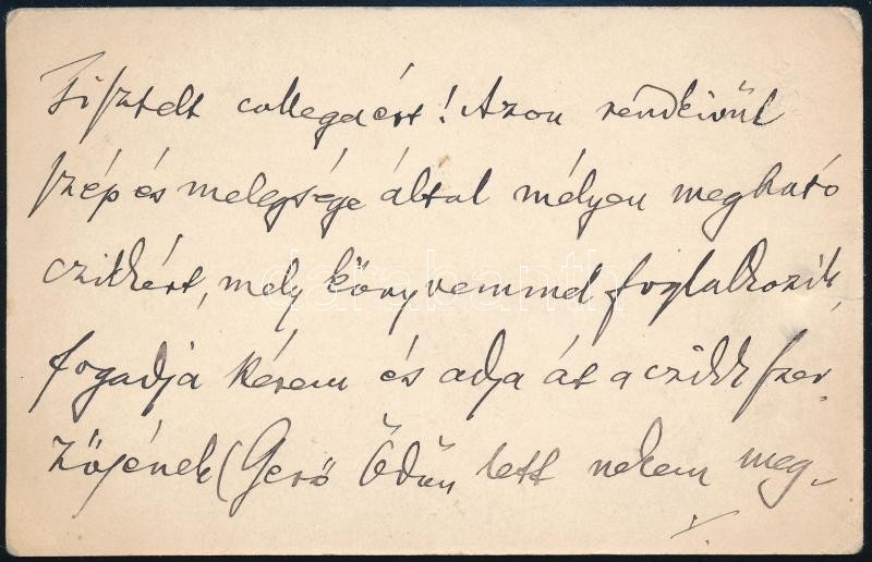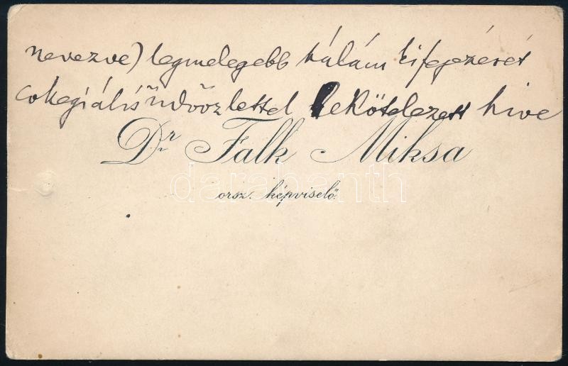 1892 Falk Miksa (1828-1908) író, politikus, országgyűlési képviselő autográf köszönő sorai névjegykártyáján Gerő Ödönnek (1863-1939), könyvéért írt pozitív recenziójáért.