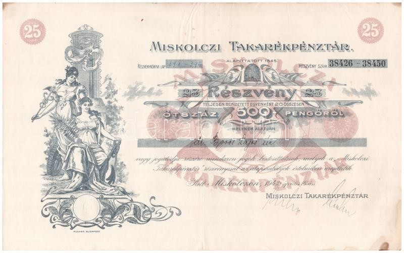"Miskolczi Takarékpénztár" twenty-five shares in one about 500 Pengő sum total, with shareholder's name, coupons and embossed stamp C:XF