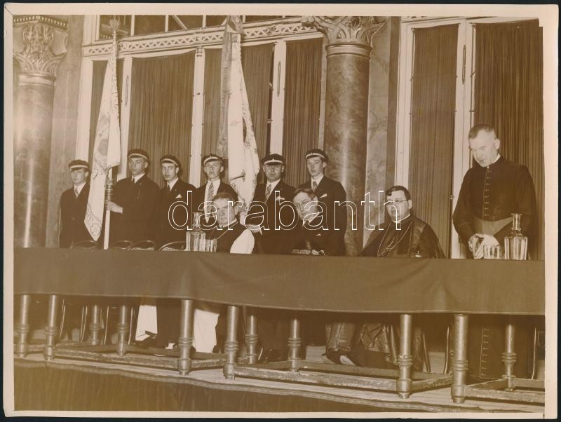 cca 1931 Klebelsberg Kuno (1875-1932) vallás- és közoktatásügyi miniszter az Országos Magyar Katolikus Főiskolai Diákszövetség 10., jubiláris kongresszusán a Vigadóban, Bp., Schäffer Gyula műterméből, a hátoldalán pecséttel jelzett, 18x24 cm