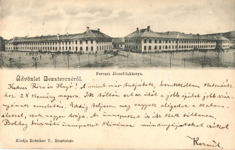 1904 Beszterce, Bistritz, Bistrita; Ferenc József laktanya. Kiadja Bot... https://www.darabanth.com/hu/340-Gyorsarveres/340.0/Kepeslapok/Erdely~1000006/1904-Beszterce-Bistritz-Bistrita-Ferenc-Jozsef-laktanya-Kiadja-Botschar-T-military-barracks-~II1909615