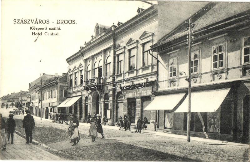 Leírás: Szászváros, Broos, Orastie; Központi szálloda, M. kir. dohány nagy tőzsde, üzletek. Kiadja a Szászvárosi Könyvnyomda rt. / hotel, tobacco shop
