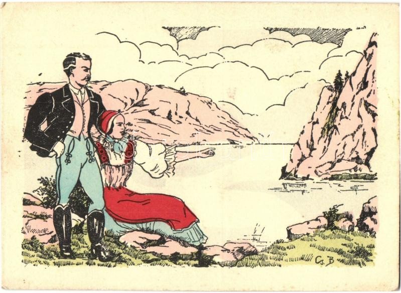 Vaskapu-szoros, Portile de Fier, Derdapska klisura; Vaskapu a Dunán. Kiadja a Délvidéki Egyetemi és Főiskolai Hallgatók Egyesülete / "Iron Gates" of the Danube, traditional costumes, irredenta art postcard s: Cs. B. (EK)