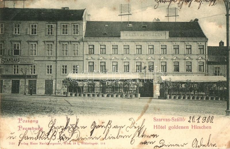 1900 Pozsony, Pressburg, Bratislava; Szarvas szálloda, Standard életbiztosító társaság vezérügynöksége. Kiadja Hans Nachbargauer / Hotel Goldenen Hirschen / hotel, insurance company (fl)