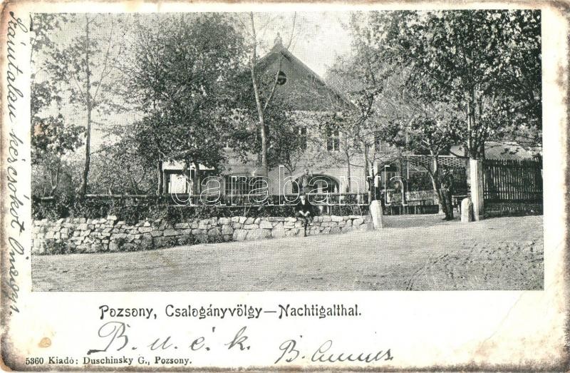 1902 Pozsony, Pressburg, Bratislava; Csalogányvölgy. Kiadja Duschinsky... https://www.darabanth.com/hu/340-Gyorsarveres/340.0/Kepeslapok/Felvidek~1000007/1902-Pozsony-Pressburg-Bratislava-Csaloganyvolgy-Kiadja-Duschinsky-G-5360-Nachtigalthal-~II1909519