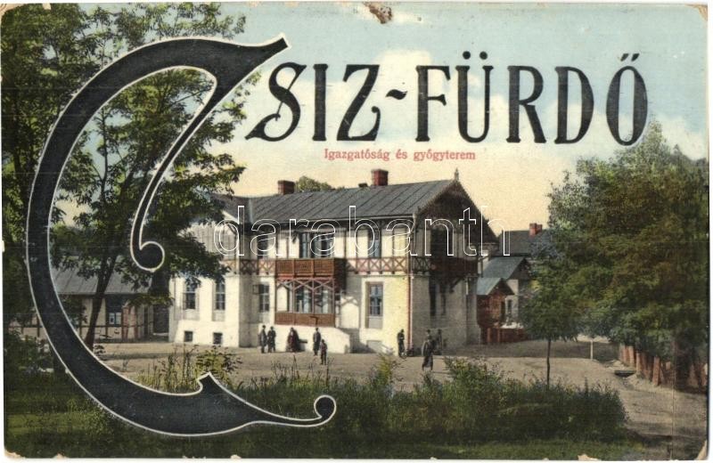 Csíz, Csízfürdő, Kúpele Cíz; Igazgatóság és gyógyterem. Kiadja Soyka Pál 46. sz. iniciálés díszítéssel / spa directorate office and spa hall, bathing house, street view; with initial decoration (EK)
