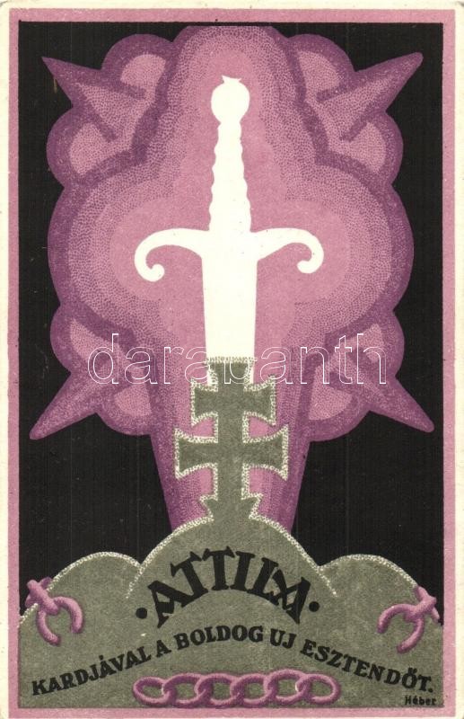 Attila kardjával a boldog új esztendőt! Kiadja a Turul Szövetség, Magyar Egyetemi és Főiskolai Bajtársi Egyesületek Országos Központja / Hungarian Irredenta New Year art postcard s: Héber (Rb)
