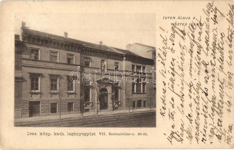 Leírás: 1900 Budapest VII. Orsz. központi katolikus legényegylet. Rottenbiller u. 20-22. (EK)