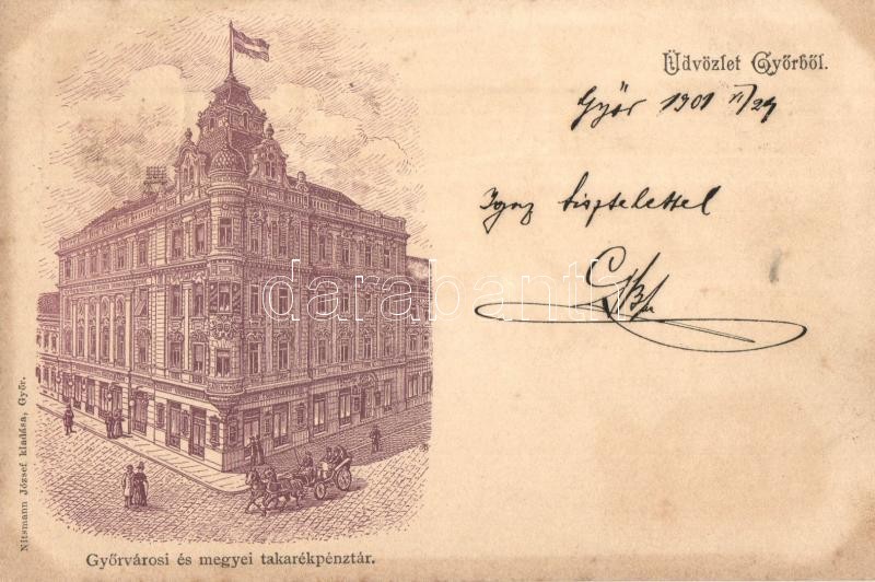 Leírás: 1901 Győr, Városi és megyei takarékpénztár. Nitsmann József kiadása